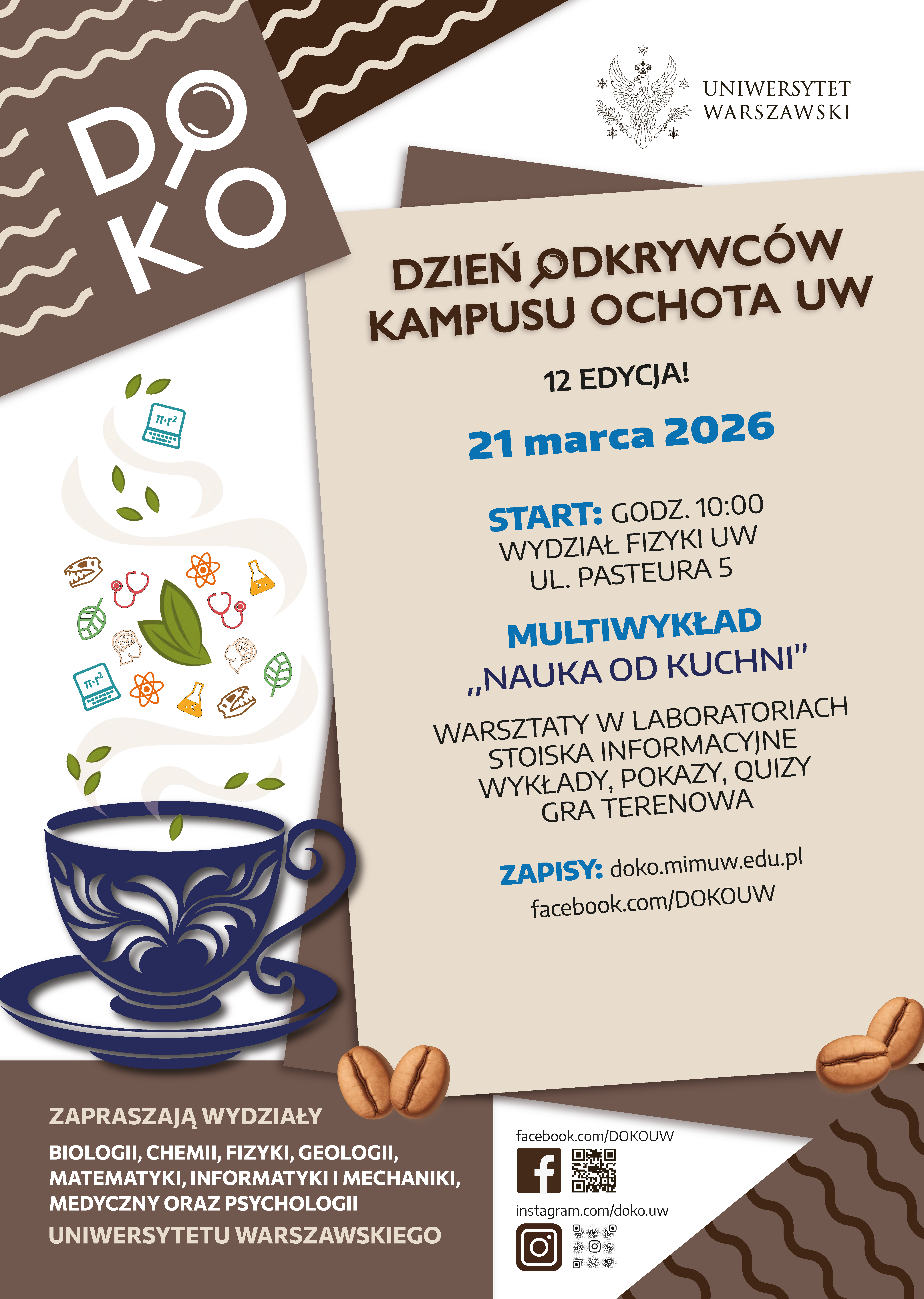 Dlaczego 2+2 czasami = 1? Co białka mają wspólnego z wiązaniem butów? Czy to, co jemy i jak jemy, wpływa na umysł i samopoczucie? Dlaczego jabłko brązowieje, a drożdże pompują balon? Jakie informacje o Wszechświecie niosą fale grawitacyjne? Jaka jest różnica między minerałem a kryształem? Które „przepisy” psychologiczne są rzetelne? Na te i wiele innych pytań będzie można znaleźć odpowiedzi podczas 12. edycji Dnia Odkrywców Kampusu Ochota Uniwersytetu Warszawskiego (DOKO) 21 marca 2026 r. Zapraszamy wszystkich, a szczególnie uczniów szkół średnich oraz ostatnich klas szkół podstawowych. | Więcej